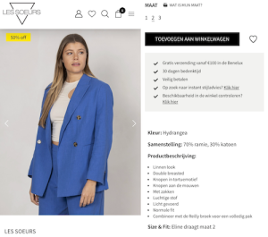 Les Soeurs geeft veel informatie over hun producten en modellen, zodat klanten een duidelijk beeld krijgen van de pasvorm voordat ze een kledingstuk aan hun winkelmandje toevoegen.